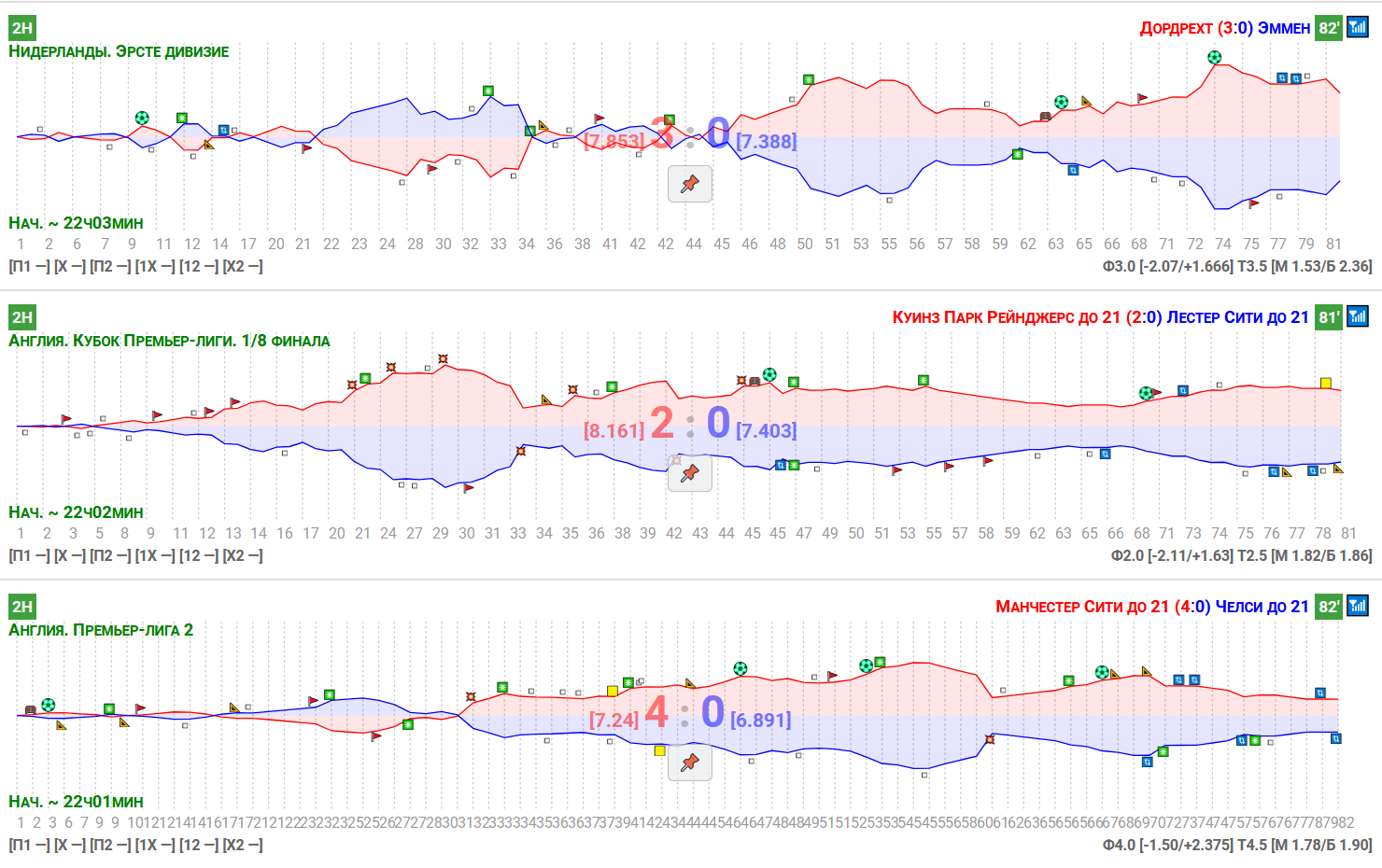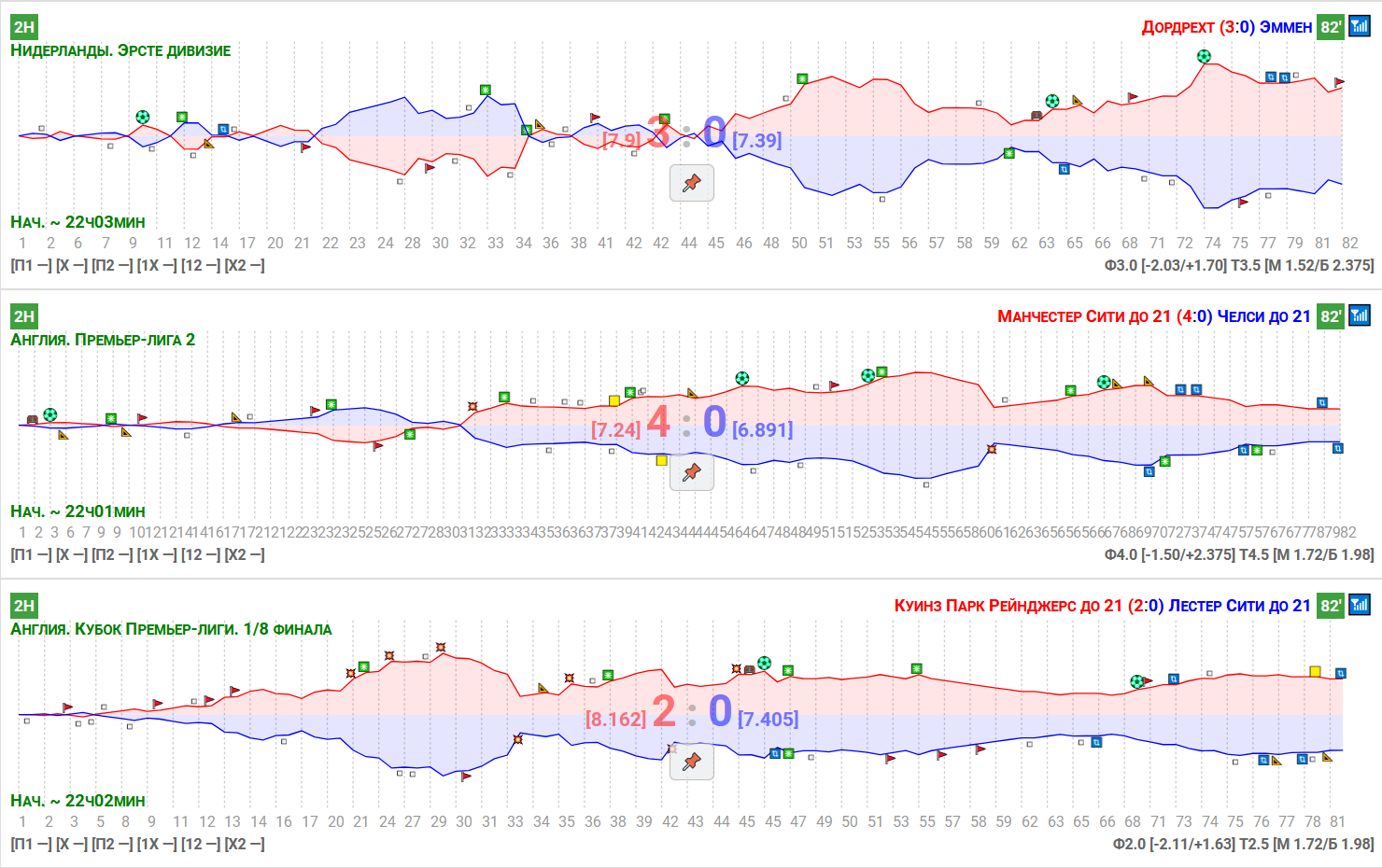 Во время работы с программой вы, через некоторое время сами, только окинув взглядом удобные информативные графики, легко начнете выбирать матчи, где или нарастает давление одной из команд, или происходит перелом в матче.